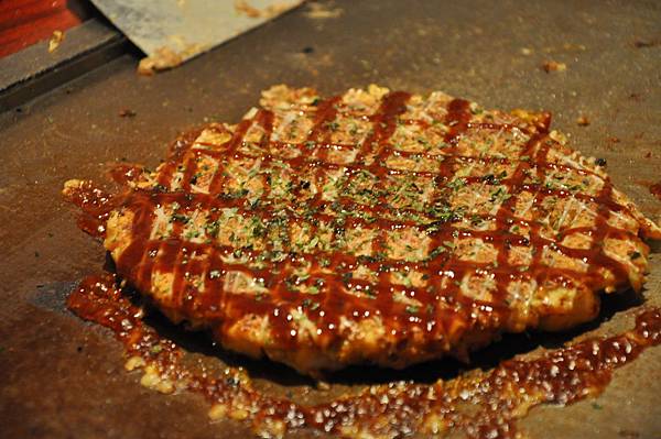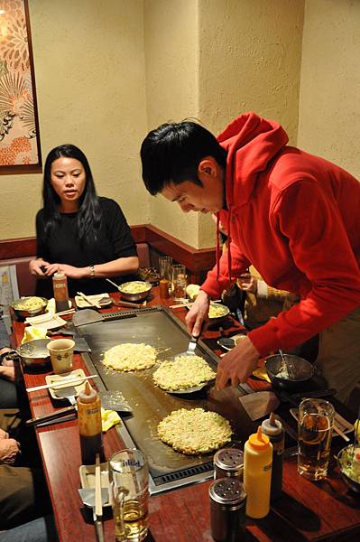 剛走不久...就在飯店附近,我們也發現一家可以自己動作做大阪燒的餐廳,終於可以吃晚餐了~歡呼!!